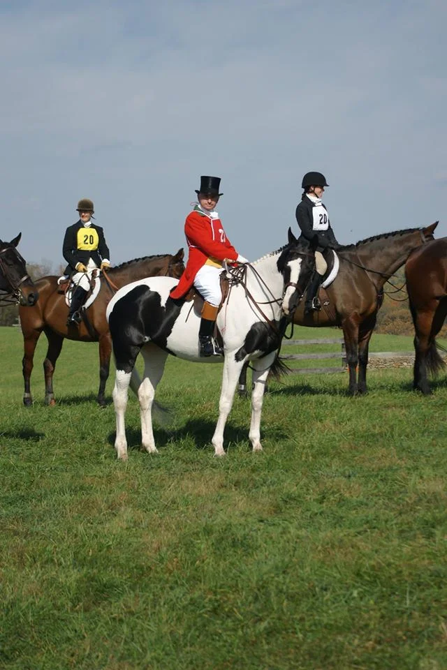 Kalliopy, 16.2 hh, pinto WB mare. Kali is an amazing jumper, and incredibly brave. She excels at leading the field out hunting, and has made it to the finals every time she competed at the Virginia Field Hunter Championships.
